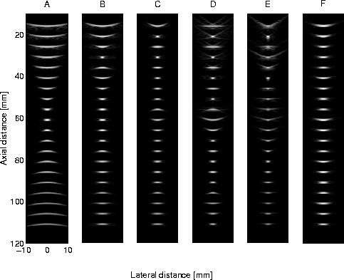 D applies the same focal zones as C, but uses 128 elements in the active
